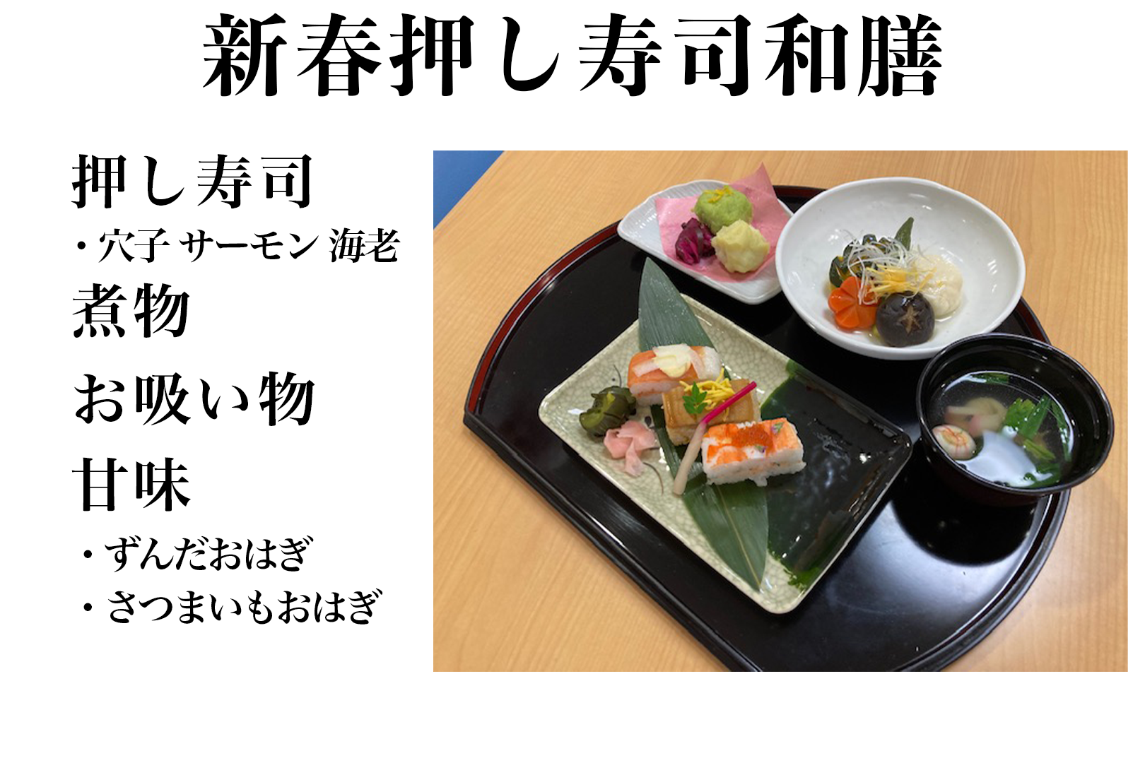 1月のイベント食として、パリアティブケアホームつきの小牧・パリアティブケアホームそらの春日井・パリアティブケアデイサービス春日井➚・パリアティブケアホーム スタイルプラス にじの大蓮にて、「新春押し寿司和膳」を召し上がっていただきました。