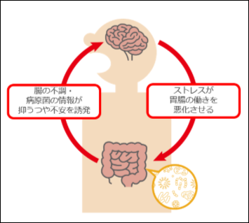 ストレスや極度な緊張を感じるとお腹の調子が悪くなる、とよく耳にしますが、これは脳がストレスという刺激を受け、誘発されたストレスホルモンが胃や腸に伝達し、胃腸の働きを悪くする、というものです。逆もまたしかりで、胃腸の状態が悪いとその情報が脳に伝達され、腹痛や腸の不快感と一緒に一時的な気分の落ち込みを指す「うつ状態」や「不安を感じる」など、気分の変化も引き起こすことが知られています。(図1)これが「腸は第二の脳」と言われるゆえんですね。