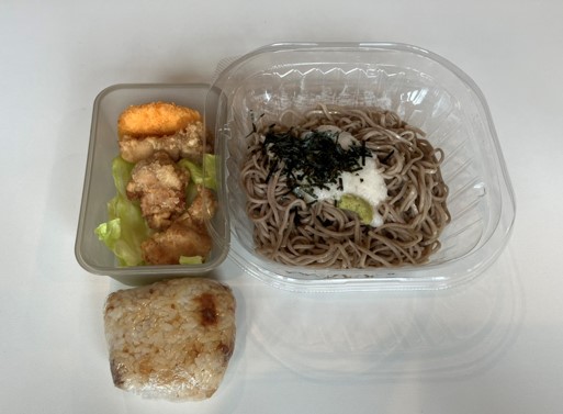 メニュー:おかかおにぎり、とりももの唐揚げ、レタス、えびカツ、とろろそば