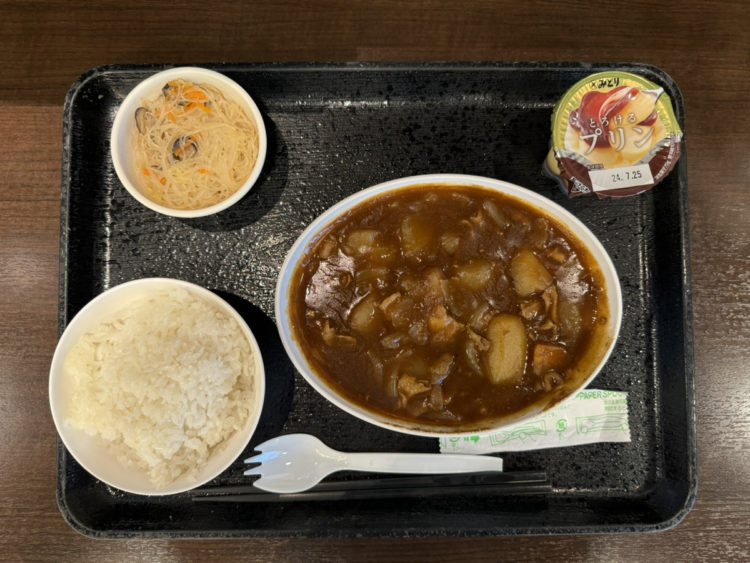 メインのおかずはポークシチューとのことで、見るだけでお腹が鳴りそうです。かなり煮込まれたシチューにみえますね。野菜もたっぷりで食べ応えのある一品ではないでしょうか。これがお手頃の値段で食べられるのはうれしい限りです。